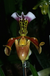 Paph. gratrixianum var. christensonianum. Note the colour variations particularly in the dorsal sepal. The amount of green to yellow at the base of the white dorsal varies as does the amount of red flushing. Also, note the variability in the amount and degree of spotting in longitudinal lines along the central portion of the dorsal.